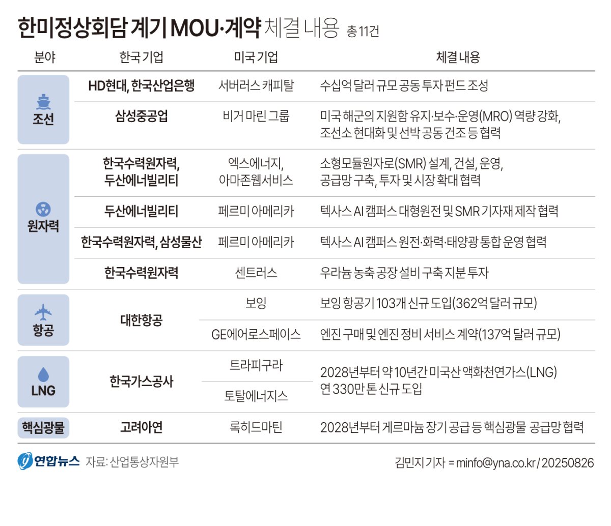 - 한·미 기업들은 이날 조선·원자력·핵심광물 분야까지 포함해 모두 11건의 계약과 양해각서를 체결