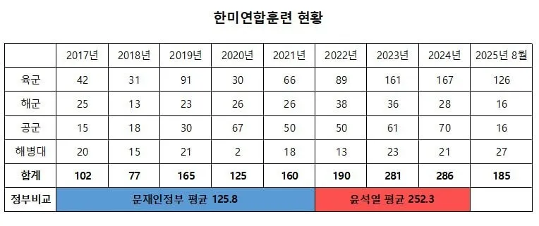 - 윤석열 정부 집권기인 2022년부터 2024년까지 한미훈련 횟수는 연 평균 252.3건으로 문재인 정부 평균 125.8건의 두 배를 넘어섬
